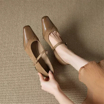 Genuine Leather Square Toe Mary Jane Heels with Rivet Detail